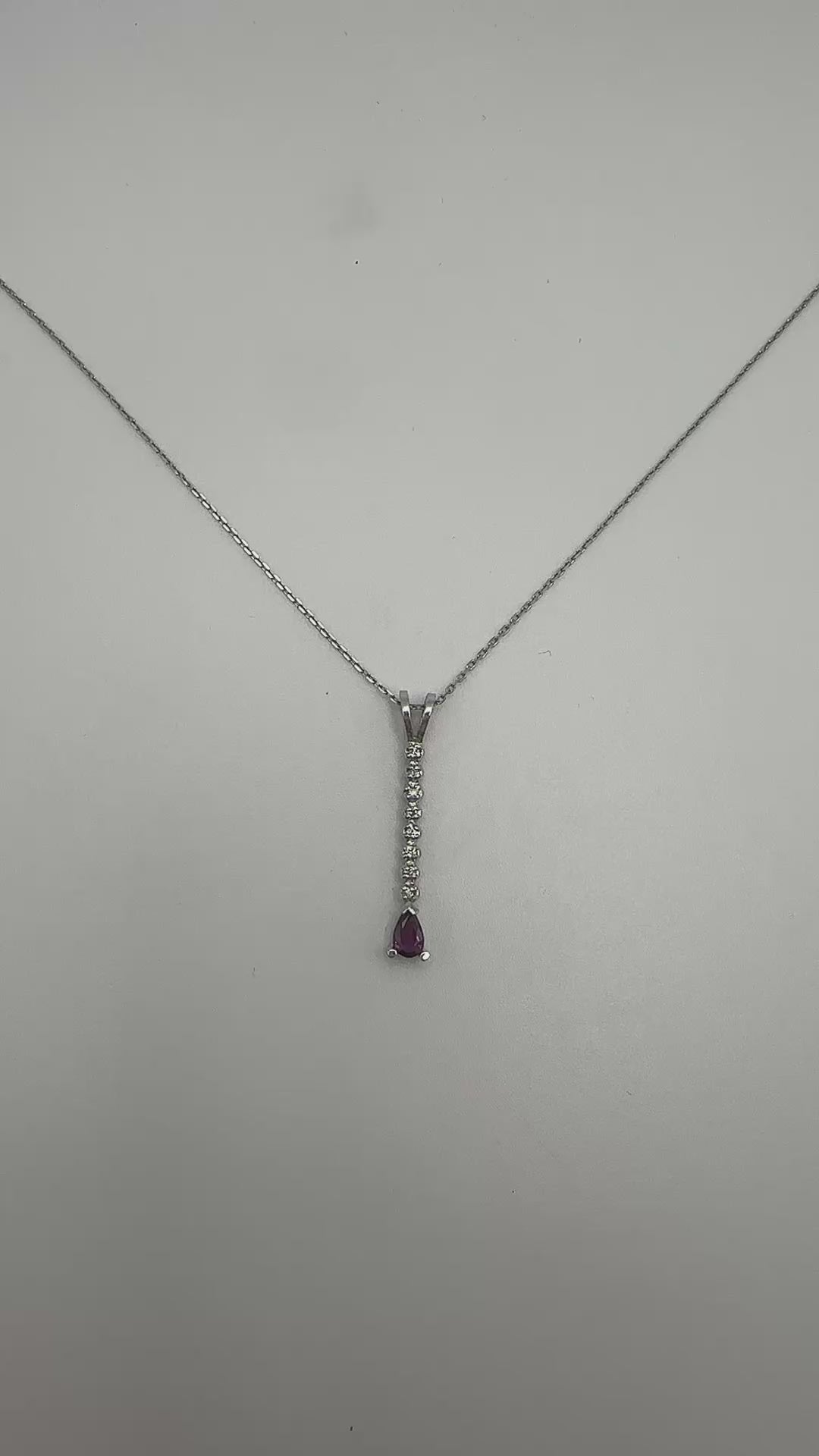 14k White Gold | 0.068 CTW (Carat Total Weight) | 1 Pear Ruby | 27.12mm Length (including bail) | 4.09mm Width (measured at pear Ruby)