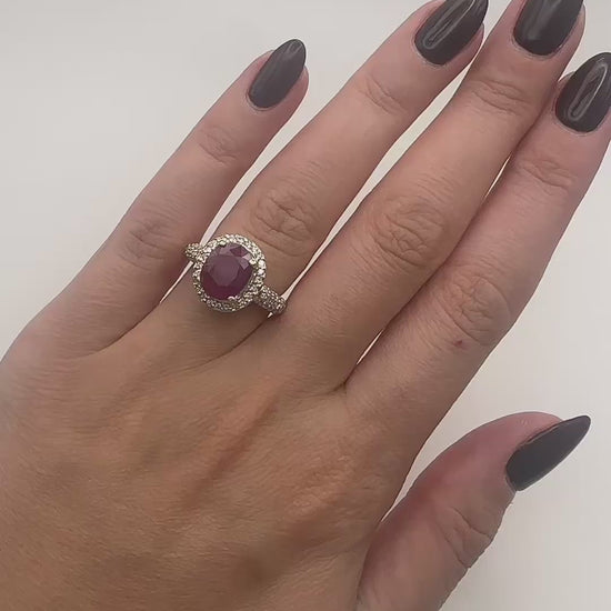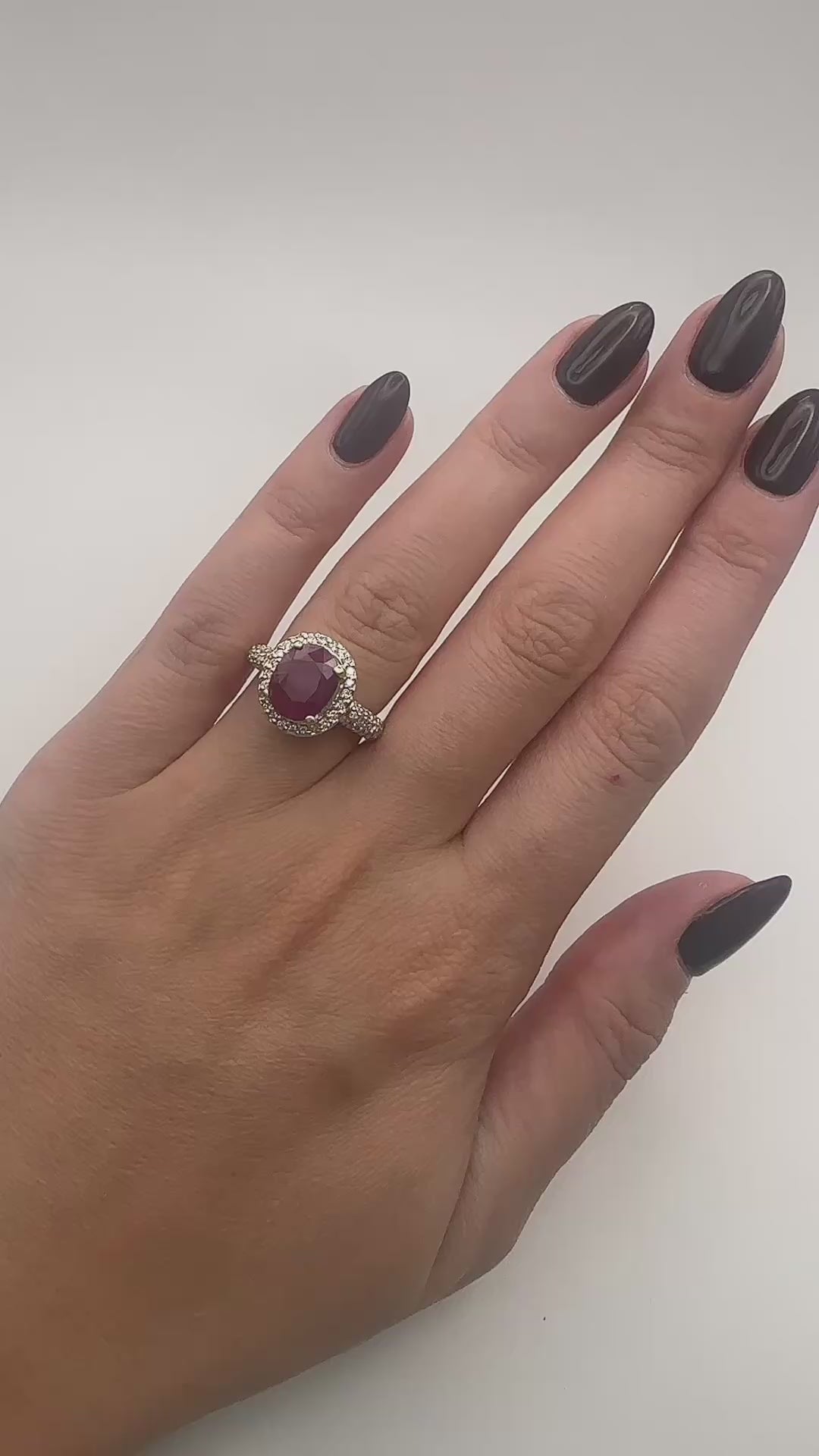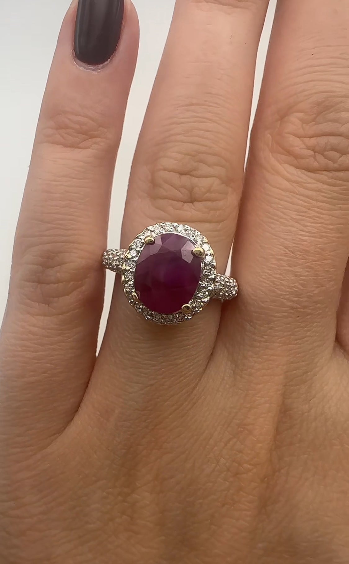 14k Yellow Gold | 0.591 CTW (Carat Total Weight) | 78 Natural Diamonds Total | 1 Oval Ruby Center Stone | 13.38mm Length | 12.53mm Width