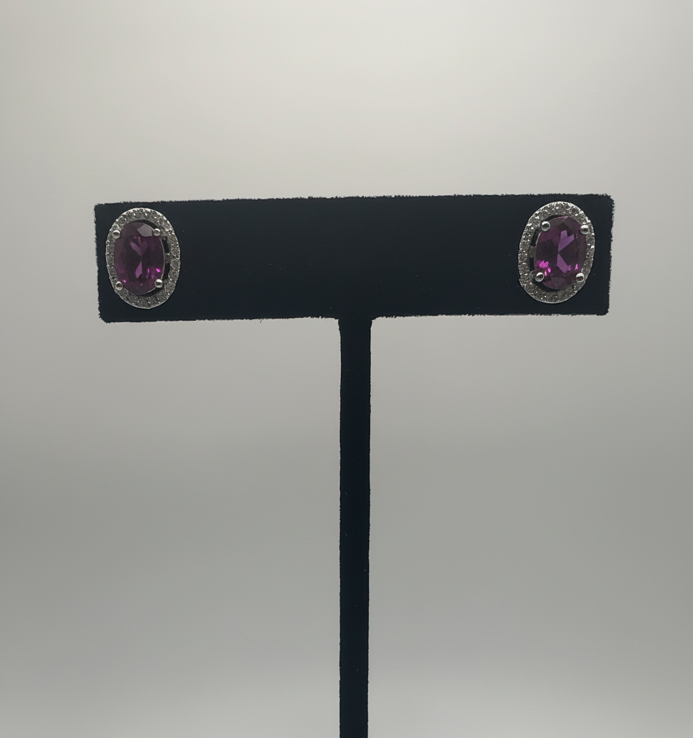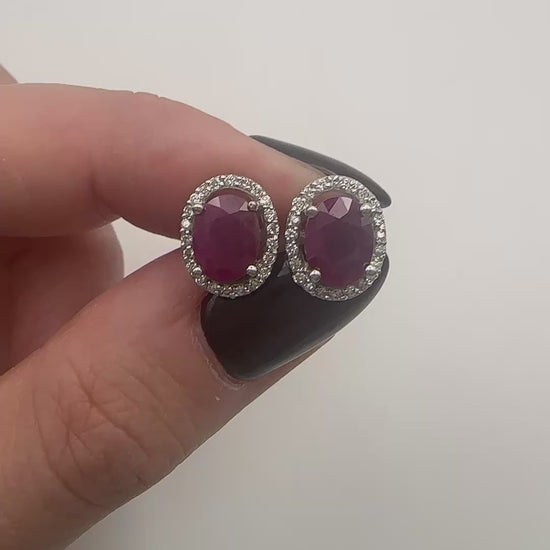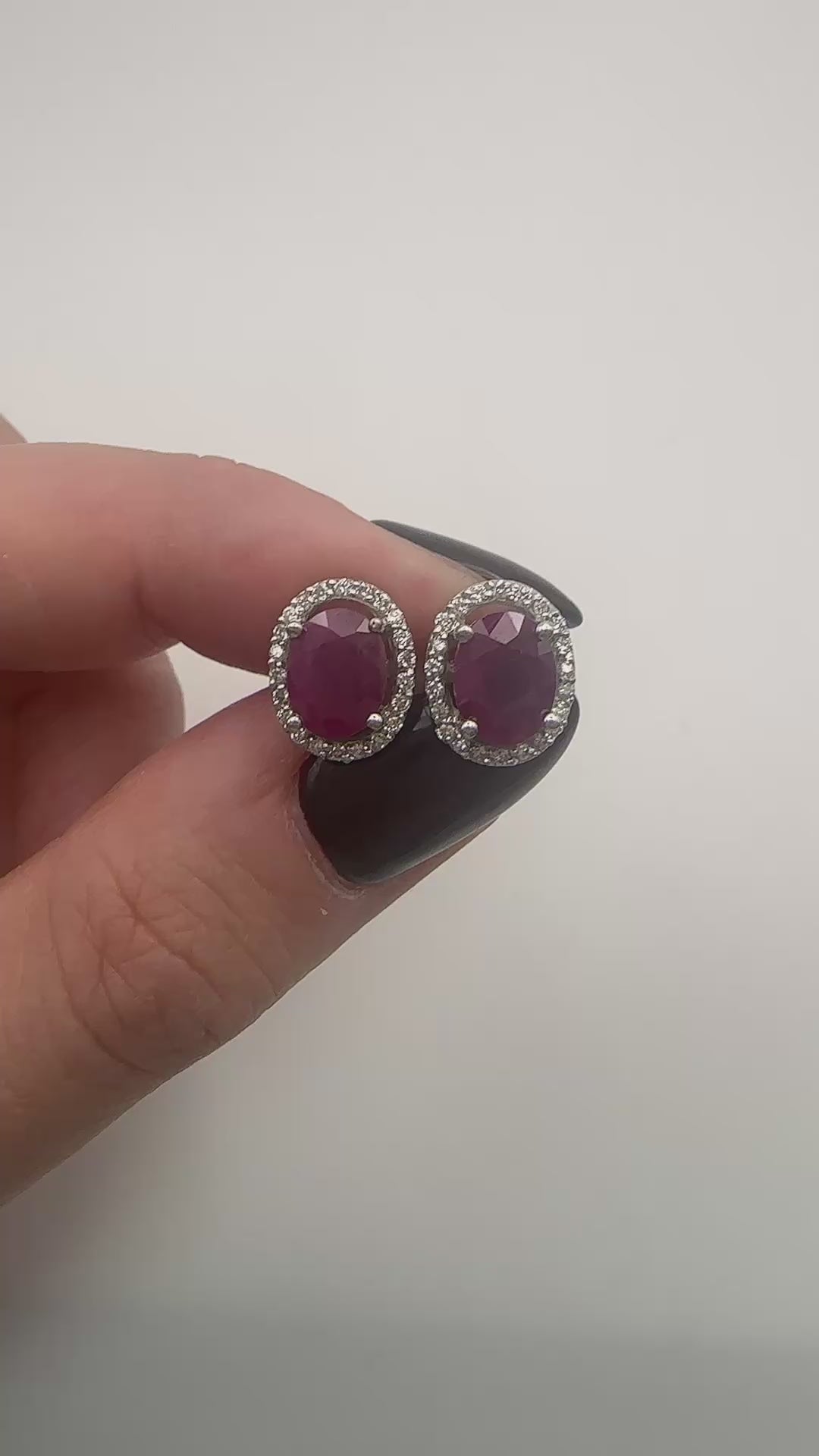 Oval Ruby Earrings with Natural Diamond Halo 14k White Gold